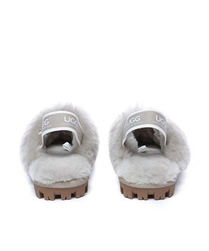 This Ugg slipper has an elastic logo band that ensures easy entry and provides extra security when you are wearing them outdoors